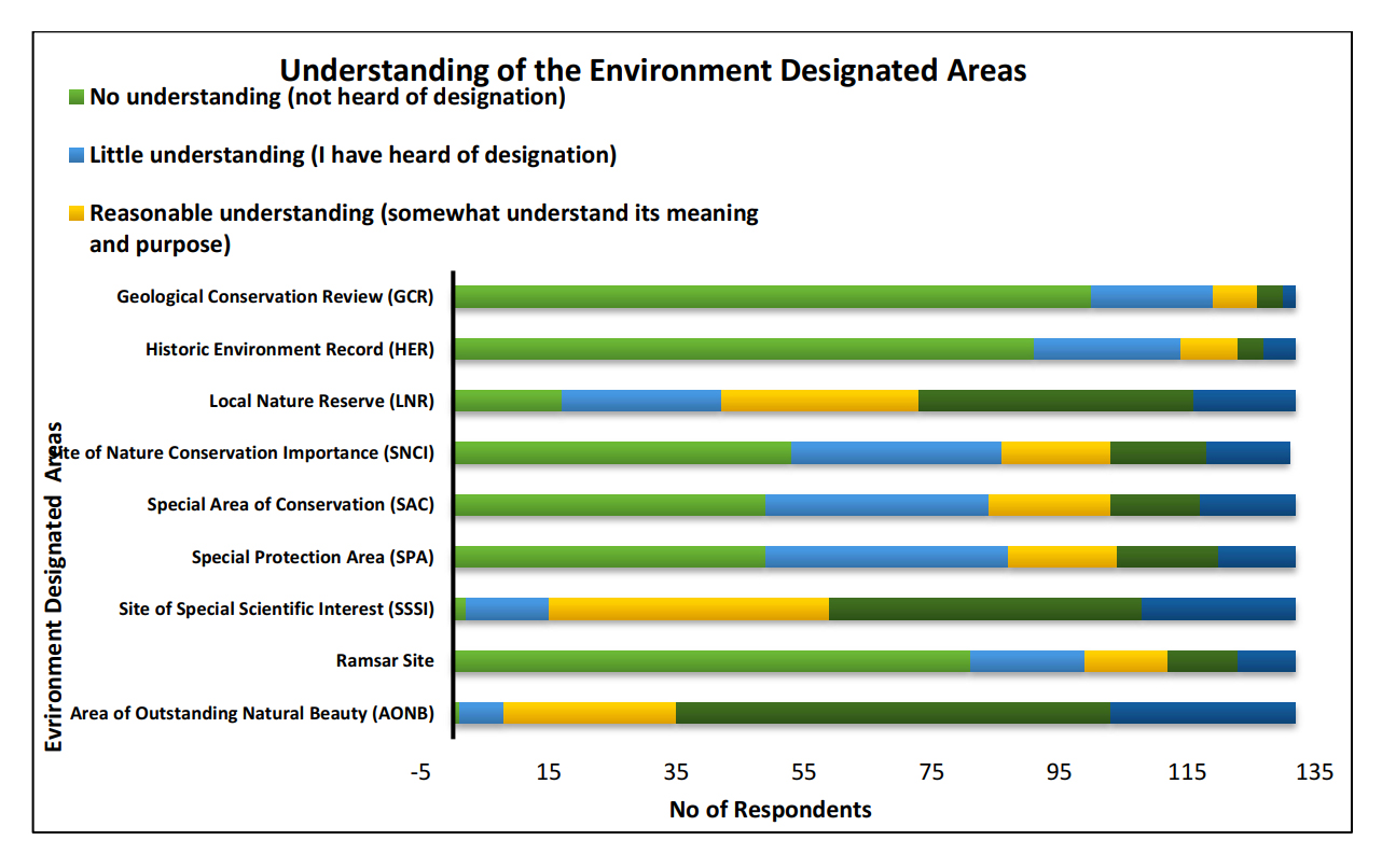 The Environmental Designation Areas (EDAs) provide a long-term means of supporting habitats, plants, and animals that find it more challenging to survive in the broader environment. Chichester Harbour has different environmental designations, including an Area of Outstanding Natural Beauty (AONB), a Ramsar site, a Site of Special Scientific Interest (SSSI), a Special Protection Area (SPA), a Special Area of Conservation (SAC), Sites of Nature Conservation Importance (SNCI), Local Nature Reserves (LNR), Historic Environment Record sites (HER), and a Geological Conservation Review site (GCR). However, the respondents’ understanding of the different EDAs in Chichester Harbour differs, as depicted in Figure 6. The response of the interviewees later confirmed this.