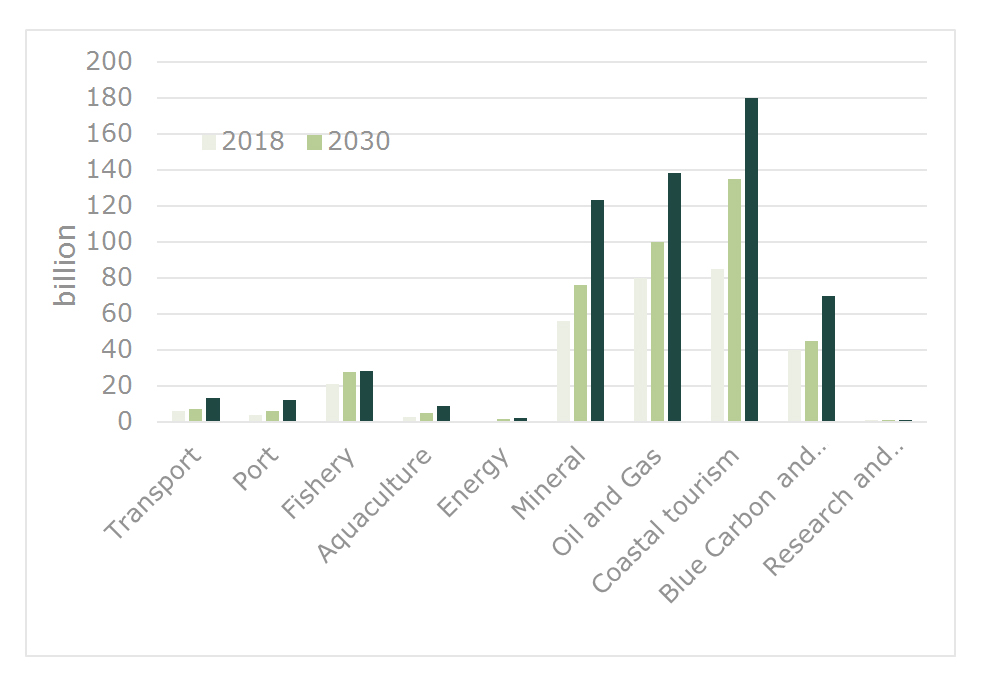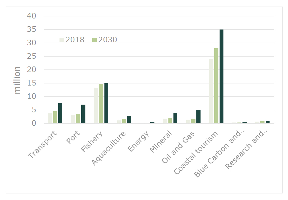 Internationally, the Organisation for Economic Co-operation and Development’s (OECD) Ocean Economy in 2030 report (2016) [12] put forward the potential development of the global ocean economy (i.e., BE) to a new level. It showed the significance of the global ocean economy as it made a contribution of approximately 2.5% of world gross value added (GVA) in 2010 (based on the OECD’s Ocean Economy Database), which is around USD 1.5 trillion. Based on a ‘business-as-usual’ scenario from 2010 to 2030, this report estimated that the global ocean economy has the potential to more than double its contribution to the GVA, reaching over USD 3 trillion. This scenario also estimates that around 40 million full-time equivalent jobs are likely to be offered in 2030.