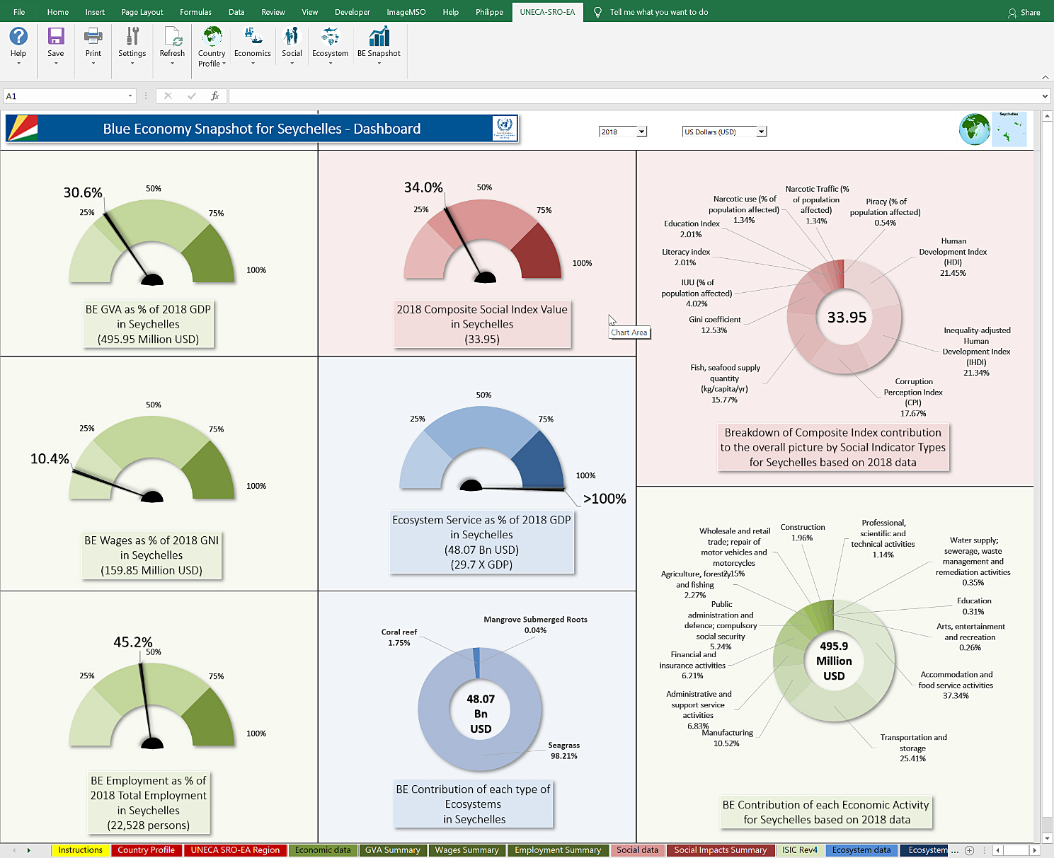 The need for accounting schemes specific to the BE have been identified as critical for achieving BE objectives [6]. The expansion of BE accounting was based on the unification of Blue Satellite accounts and Blue Ecosystem accounts which have been inscribed in strategies and working plans at various scales including the Africa Blue Economy Strategy at the continental scale; the Indian Ocean Commission (IOC) [8] and Intergovernmental Agency for Development Strategies (IGAD) at the regional scale; and by the Seychelles, Mauritius and Kenya at the national scale [9]. Other countries beyond Africa which have also incorporated Blue Satellite Accounts or Ecosystem Accounts within their national Blue Economy strategies include Barbados, the Bahamas, and Jamaica.