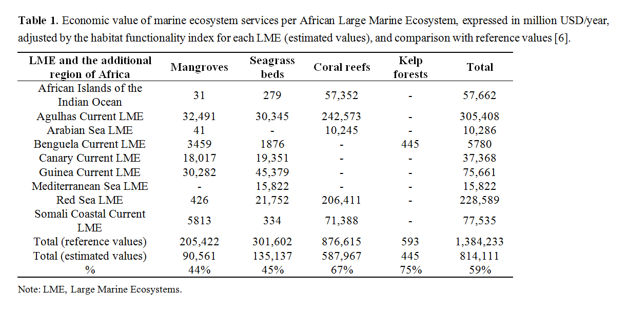 Table 1. Economic value of marine ecosystem services per African Large Marine Ecosystem, expressed in million USD/year, adjusted by the habitat functionality index for each LME (estimated values), and comparison with reference values [6].