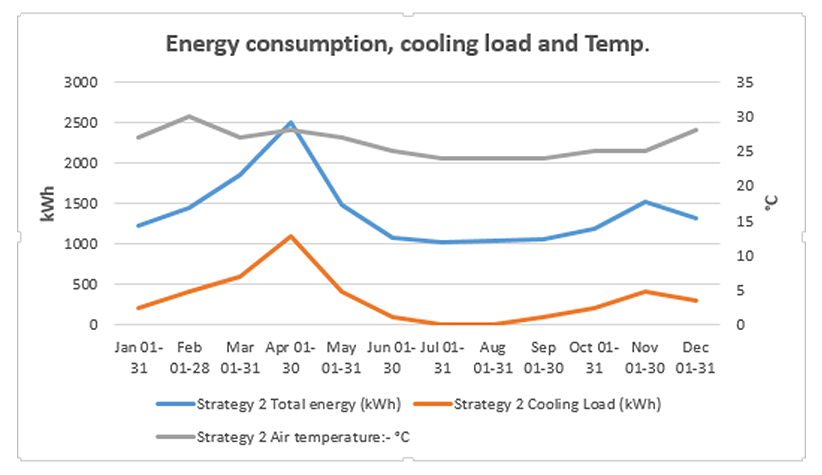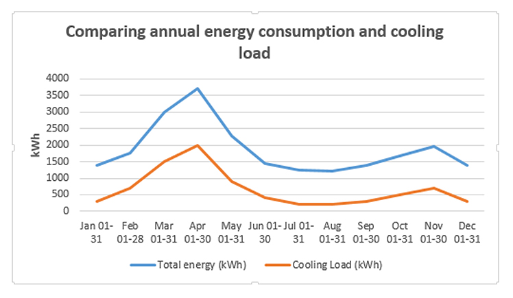 In Figure 11, the peak energy consumption and cooling load are in the summer month of April, and the lowest energy consumption is in the months of August. Also, energy use is very high during the summer months due to the high demand for cooling the indoor space and low during the rainy season and winter months. The cooling demand reduces as soon as the rainy season commences in mid-May. The chart in Figure 11 also shows a strong relationship between the energy use of the building and the cooling load where a high cooling load leads to high energy consumption and vice versa. Similarly, the chart in Figure 12 shows a positive relationship between the cooling load and indoor air temperature. That is, an increase or decrease in indoor air temperature resulted in an increase or decrease in cooling load. Higher cooling load is observed in the summer months of March, April and May because the indoor air temperature in those months is higher, above the comfort conditions of 23–26 ℃ recommended Akande & Michael [4], ASHRAE [36], Hayatu et al [5] and ISO 7730 [37].