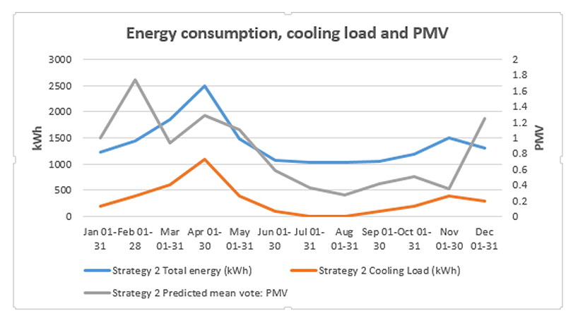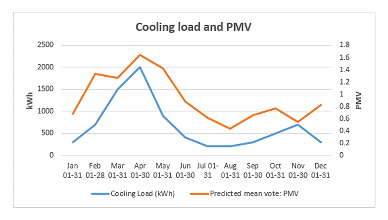 The charts in Figures 14 and 15 show the average monthly energy use, cooling load, air temperature and PMV. In Figure 14, the relationship between indoor air temperature and cooling load can be analysed. Higher temperatures that are outside of the comfort zone, leading to high energy consumption and cooling load are experienced in the months of March, April and May. The rest of the months are within the temperature range of 23–26 ℃ [4,5,36,37], keeping energy consumption and cooling load low in those months. In Figure 15, the PMV is acceptable when the temperature is kept within acceptable comfort conditions by the use of air conditioning (AC) systems [37,39,40].