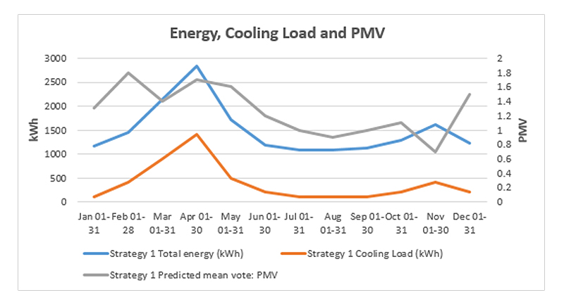 The charts in Figures 16 and 17 show the average monthly energy use, cooling load, air temperature and predicted mean vote (PMV). In Figure 16, higher temperatures that are outside of the comfort zone, leading to high energy consumption and cooling load are observed in the summer months of March, April and May. The rest of the months are within the temperature range of 23–26 ℃ [5,36,37,40], keeping energy consumption and cooling load low in those months. The months of June to November are within the acceptable PMV limit of –0.5 to +0.5, making the building’s indoor space comfortable for occupants as seen in Figure 17.