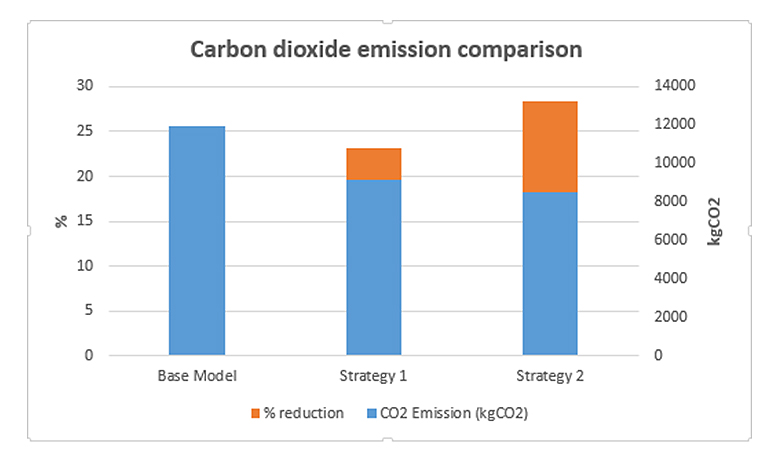 The adoption of any of these strategies can also lead to a reduction in carbon-dioxide emissions as seen in Figure 19. When compared to the base model, there is a reduction in carbon-dioxide emissions by 23.2% and 28.4% when strategy 1 or 2 is used respectively. Figure 20 shows that the cost of electricity can also be reduced by 20.4% and 25.7% when strategy 1 or 2 is adopted respectively. Similarly, strategy 2 performed better when compared to the base model and strategy 1 as 50% of the months achieved a PPD of less than 15% as seen in Figure 21.