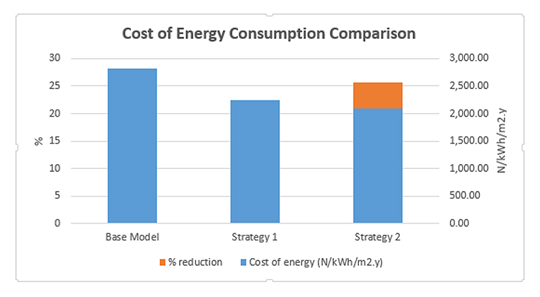 Comparing base model to strategies 1 and 2In Figure 18, thermal insulation of the modern building envelope (strategy 2) performed better in terms of energy use and cooling load, followed by the traditional building envelope (strategy 1) and lastly the base model. The Base model can also be compared to strategy 1 (Traditional Building Envelope) and strategy 2 (Thermal Insulation of Modern Building Envelope). There is a reduction in energy use by 20.4% and 25.7% and in cooling load by 36.6% and 47.6% when strategy 1 or 2 is used respectively. The high performance of strategy 2 (Thermal insulation of Modern building envelope) is due to the presence of thermal insulation in the building envelope compared to the absence of thermal insulation in the building envelope of the base model and strategy 1 (traditional building envelope). Thermal insulation of the building envelope doesn’t only prevent heat from coming in or going out of the building leading to a reduction in cooling load by 38% [72], but can also serve as a moisture barrier which can reduce energy use due to dehumidification in the wet-humid season as seen in the climate analysis in Figure 4 [69,73,74,76,84].