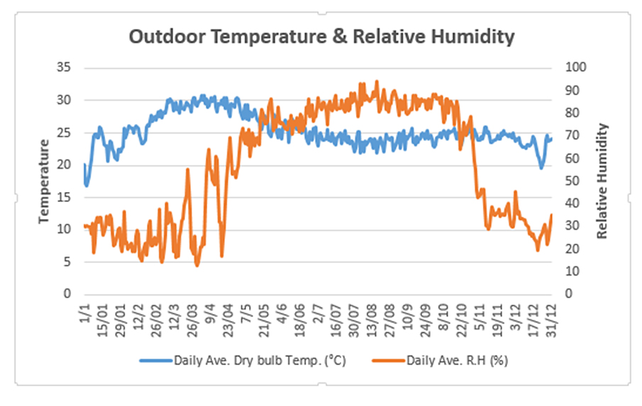 Climate Analysis of Kano, NigeriaClimate consultant software is used to analyse the climate of Kano, Nigeria using historical weather data of 2007–2021 derived from climate.onebuilding.org. As shown in Figure 4, the temperature is as low as 13.7 ℃ in January and as high as 38.7 ℃ in April and low humidity in the months of January–May and October to December. The figure also shows a high diurnal temperature variation of 15.7 ℃ in the dry season (January) and a low diurnal temperature variation of 5 ℃ in the rainy season (August). Although the average dry-bulb temperature in all the months has exceeded the comfort zone limits of 23–26 ℃, the rainy season months are close to the comfort zone limits. Additionally, the outdoor relative humidity is high (exceeding the comfort limit of 30%–70%) during the rainy season in the months of June, July, August and September. This could lead to condensation or highly humid indoor space if the building envelope is not well insulated or does not have a moisture barrier and/or if there is moisture infiltration through building openings.