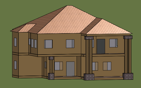 Numerical Simulation Layout and the description of the base modelThe base case building was designed in AutoCAD software (Figure 6), the design was then exported in Dxf format and imported into IES VE software, thereby, producing the base model in IES VE (Figure 7). The model is a four (4) bedroom one-storey duplex modern residential building for a high-income group that has an entrance porch, a living area, an anteroom, dining, a visitor’s bedroom, a toilet, a store, and kitchen on the ground floor and a general living room, chapel, 3-bedrooms, and toilets on the first floor. The living area on the ground floor is facing the south-east axis and the one on the first floor is facing the south-west direction, this could be beneficial in the winter when sunlight is desired. The kitchen is positioned to the northeast axis to receive sunlight in the morning. Two bedrooms on the first floor are facing the East, one bedroom in the west, and the general living room is facing the south. The building model measures 15,647 mm long and 14,650 mm wide, and height of 6800 mm (3000 mm each from floor level) from the outside ground level, and a roof height of 4951 mm. The total floor area of the building is 497.89 m² and a volume of 1140.94 m³. The rooms were grouped to enable easy assigning of profiles, circulation and lettable area, ventilation/infiltration rates, and internal heat gains.
