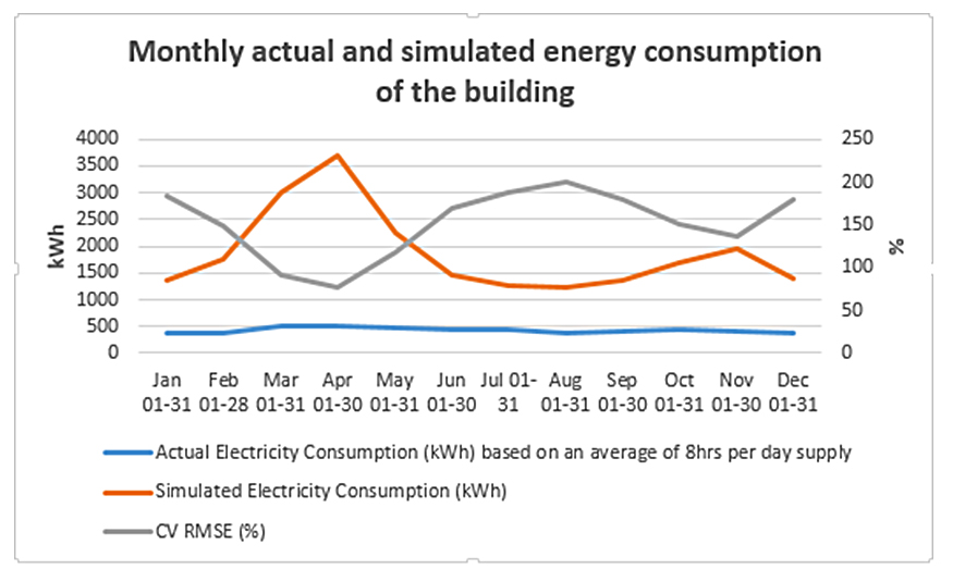 Given the above challenges encountered, the author recommends the use of a measuring instrument to accurately calibrate the simulated results with the measured results to record electricity consumption of energy use in the building that is not from the national grid and also to compare consumption patterns of different families.