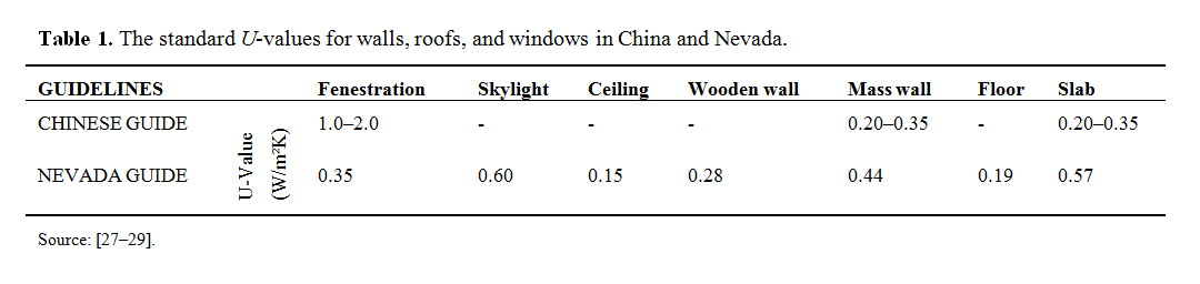 Given the above, the standard U-values recommended by Chinese and Nevada guides will be used for comparison in this study [17,27,28]. This is because they have a climate zone that is similar to the climate zone under study. The Table 1 below shows the recommended U-values for Chinese and Nevada Guides. These recommended U-values are essential towards improving the energy efficiency and indoor thermal comfort of the building occupants as they spend most of their time indoors.