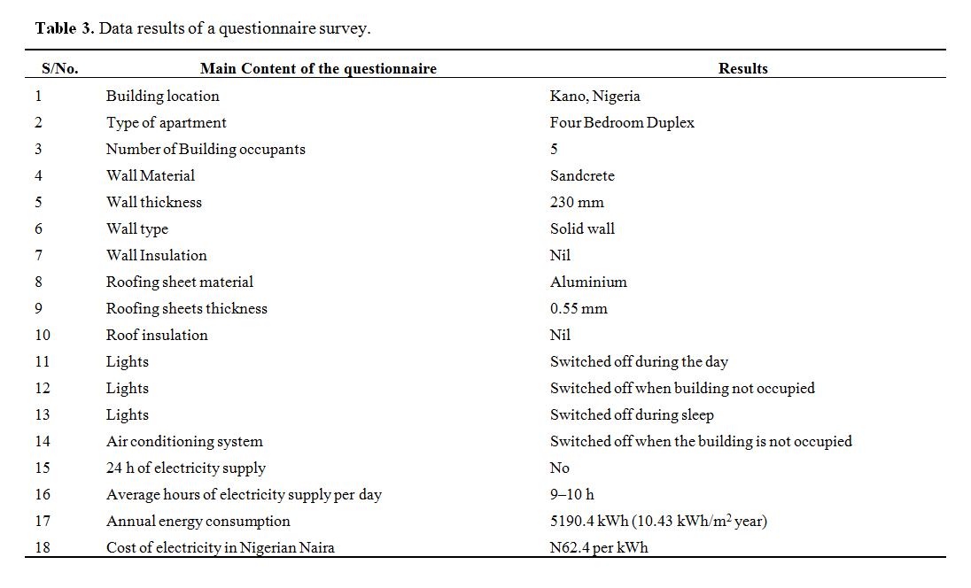 Questionnaire SurveyedA questionnaire was designed to assess the current state of the building under study. The main content of the questionnaire is: Section A covers questions regarding the building location, type and occupants, section B covers the building envelope properties, section C contains questions relating to the occupancy behaviour and Section D has to do with energy consumption of the building. The questionnaire was administered to the building occupant and the responses were used in the development of the base model in IES VE software the energy use will be compared to the results obtained from the simulation.