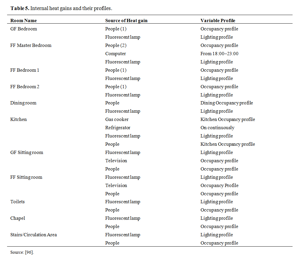 Lighting profile/Internal heat gainsThe sunshine hours in Kano range between 8–11.3 h. For this reason, lighting was set to go off by 7:00 a.m. and come back on by 5:00 p.m. Also, the lights are off during sleep (22:30–6:00) [17,95]. The internal heat gains considered in this study are those from people, lighting, and equipment/appliances as presented in Table 5.
