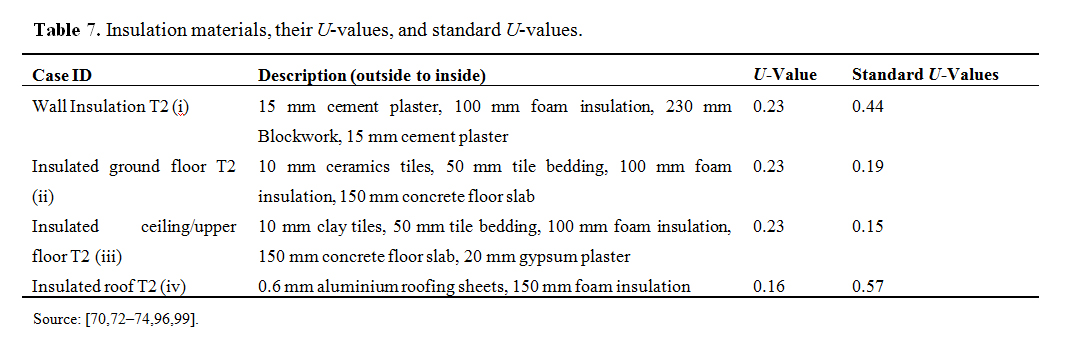 Strategy 2: Thermal insulation of modern building envelopeThis strategy introduced insulation to the wall, floor and roof of the building. Foam insulation is used in this study ([72]. Table 7 shows the positioning and description of the insulation materials, their U-values and the standard U-values recommended by the Nevada guide for hot summer and cold winter climates [27,28].