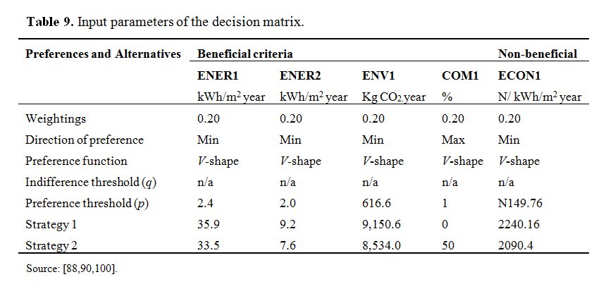 Additionally, the sensitivity analysis result shows the thermal insulation in the modern building envelope (strategy 2) performed better in all the criteria as they are located on the same axis, pointing towards the decision stick. Strategy 2 also has the highest positive outranking flow, lower negative outranking flow and highest net outranking flow. The output from the GAIA plane shows that the Percentage of satisfied people is not expressing similar preference with other criteria because the criterion axis is longer and is not oriented in approximately the same direction with other criteria and the red decision stick. The total annual energy consumption, cooling load, CO2 emissions and cost of electricity are expressing similar preferences as they are aligned in the same axes and towards the direction of the red decision stick. There is also a moderate conflict among all the criteria because the red decision stick is pointed towards the right as other criteria.