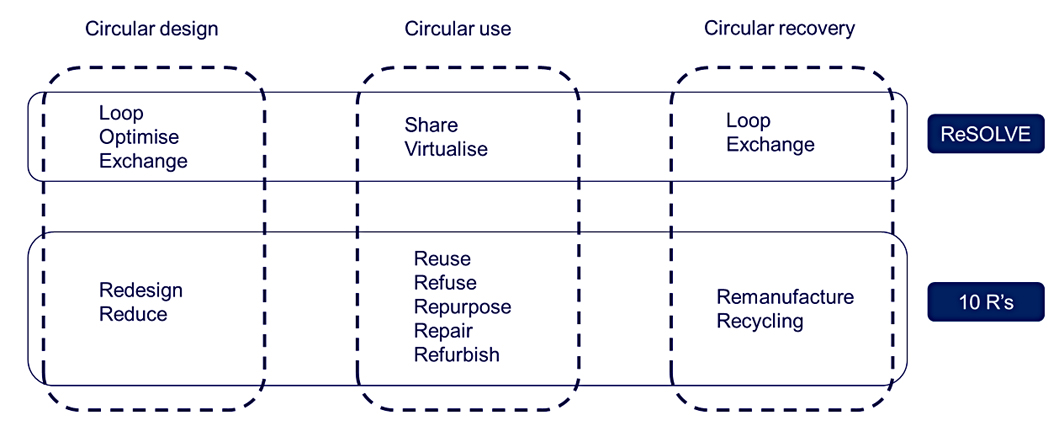 Figure 2. Possible stages to apply 10 R’s for circularity and ReSOLVE framework as CE strategies according to 3 circular categories of circular design, circular use and circular recovery identified by ARUP [6].
