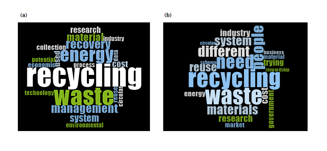 Figures 5a and 5b show the exact match of 20 most frequent words in the CE literature review regarding e-waste and in the interviews respectively. Clearly, both figures highlight recycling waste within the solutions for e-waste management, leaving reuse in the second place. Other “R” strategies have been less explored in literature and less known by the interviewees. Both figures do not prioritise “circular”. Interestingly Figure 5b shows the frequency (priority) of “need” and “people” which examines the needs and role of people in waste management. Therefore, following design thinking processes, the needs and role of people (stakeholders) are identified through interviews. The interviews outputs translated into suggestions for PV management system in Australia. World clouds helped to visualize some of the requirements for an ideal PV waste management system.
