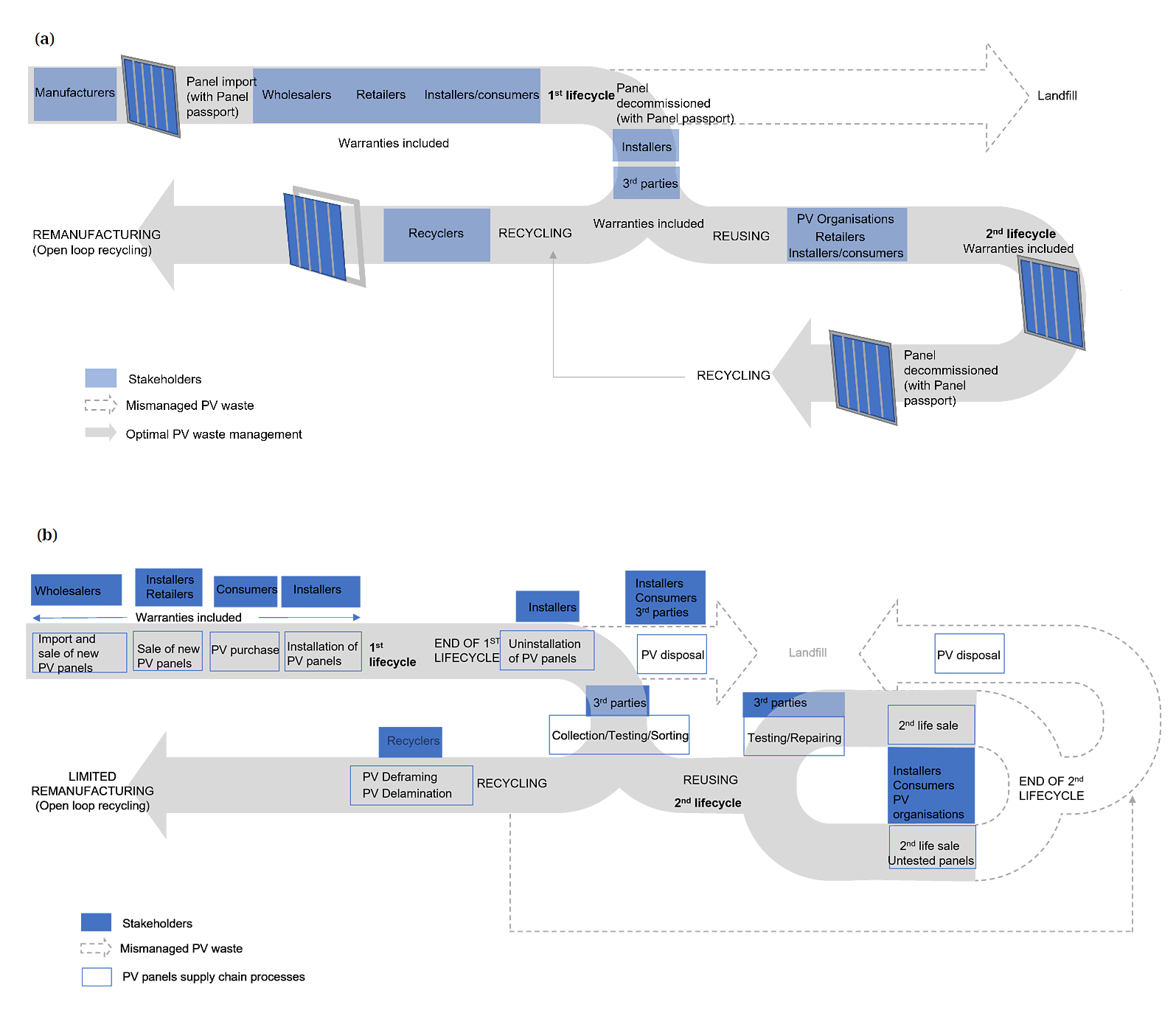 From this perspective digital tools such as electronic certification/number for waste electrical and electronic equipment such as the German registration system “Stiftung EAR”, can improve reliability and validation of performance for possible secondary markets, giving place for new re-certifications. Currently the most common strategy for PV waste management is recycling. There are several papers in the literature regarding PV recycling and its economic benefits and limitations [8,9,12,13,15,17,27,33–40], contrasting with very little literature on PV panel reuse. A detailed study on reuse by IEA PVPS Task 12 shows that reuse is feasible, but it is specific to each country and case. Technical feasibility of PV repair has been studied and proven, repair on site and preventive maintenance can lead to highly significant savings. However, from an economical and environmental perspective there are uncertainties that are yet to be addressed as the results from repair solutions are unknown in the long-term [41].