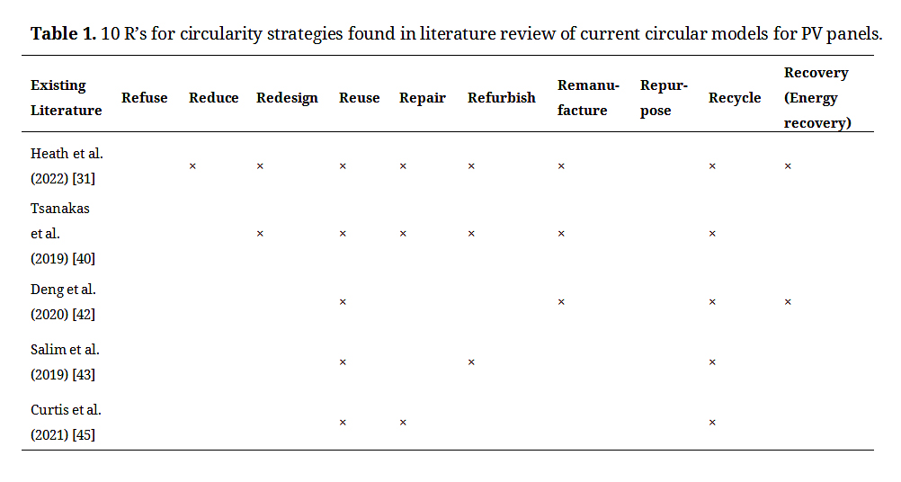 Table 1. 10 R’s for circularity strategies found in literature review of current circular models for PV panels.