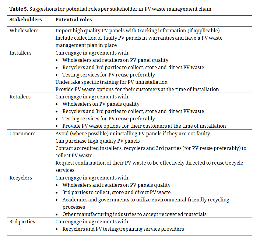 Table 5. Suggestions for potential roles per stakeholder in PV waste management chain.
