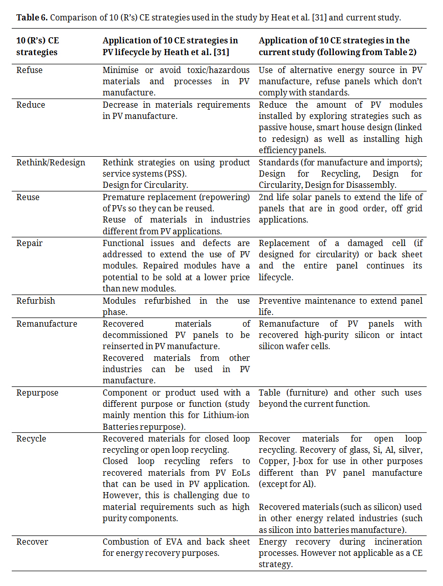 A similar study undertaken in US by Heath et al. [31] analyses the role of digital information systems in improvement of application of CE strategies in PV modules lifecycle (manufacturing phase, use phase and EoL phase), is important to note the study has a quantitative and material flow focus and has several references for their R’s strategies. The current study has as only one reference for 10 R’s strategies, Cramer (2017). Based on this difference, this study has some variations in the applications of R’s strategies compared to [31]. Table 6 depicts a summary of the differences and similarities between the applications suggested in [31] and the applications investigated for the current study.