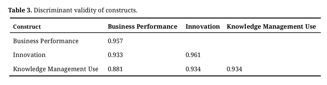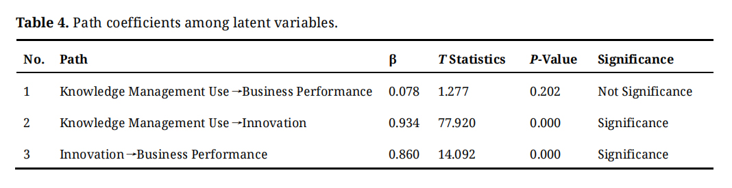 Hypothesis testingThe results of the analysis, as shown in Table 4, provide support for hypothesis 1. They indicate that the adoption of knowledge management does not have a significant impact on business performance (p = 0.202). Hypothesis 2 posits that the utilization of knowledge management has a substantial influence on innovation (p = 0.000). Hypothesis 3 establishes that innovation has a substantial influence on business performance (p = 0.000).