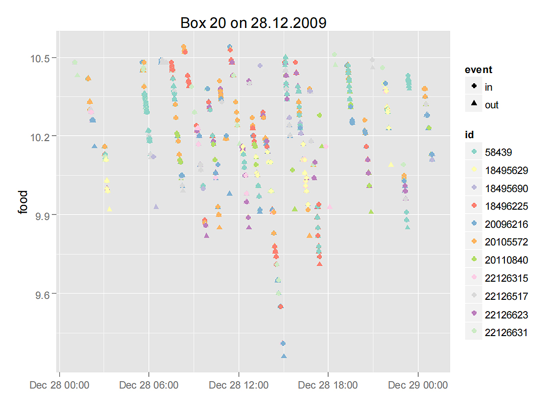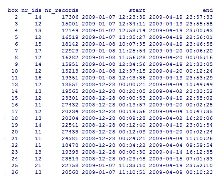 Figure 1 shows some statistics for each of the 24 boxes of feed consumption data (numbered from 2 to 26). Each row shows the number of individuals, the number events registered (“occupancy events”), and the period when data has been recorded.