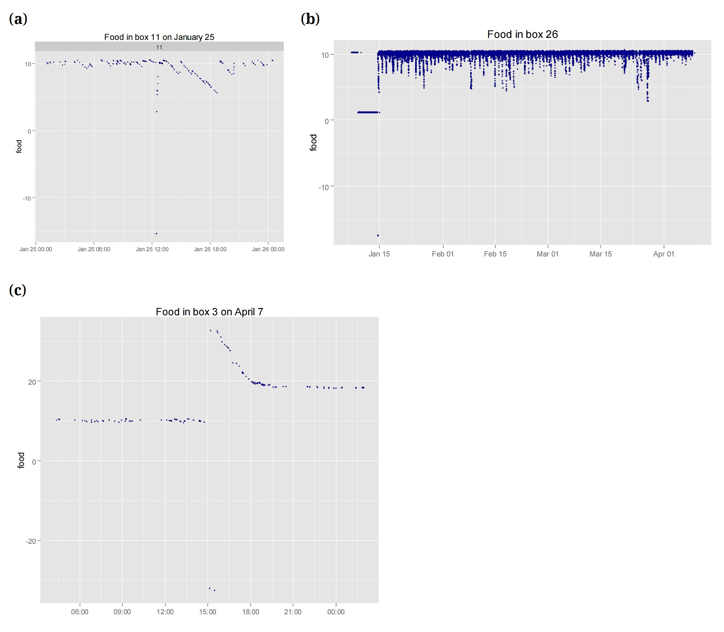 The behavior of the animals and their interactions must be inferred from the data through the identification and quantification of relevant variables that influence feeding patterns. The data must be defined, modeled, filtered, and cleaned to extract meaningful variables.