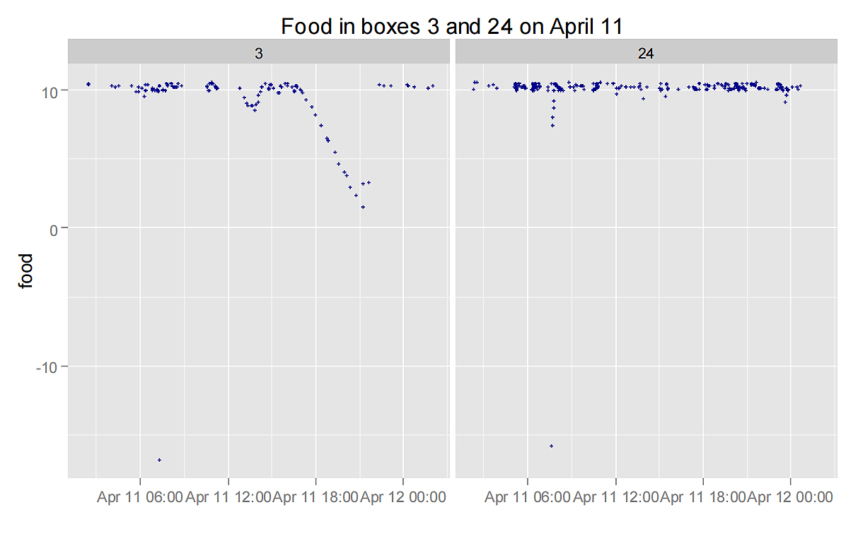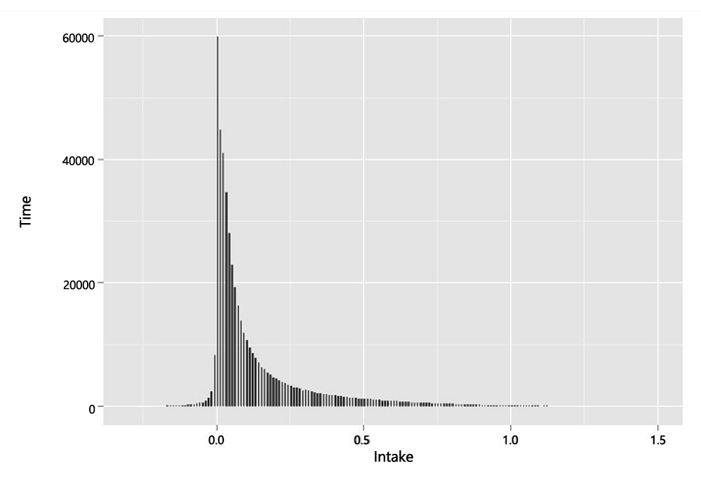 Figure 6 shows the intake distribution of the animals at each time by the feeding device. The experiment’s raw data contains some clear errors, one can detect that some inferred intakes are negative.
