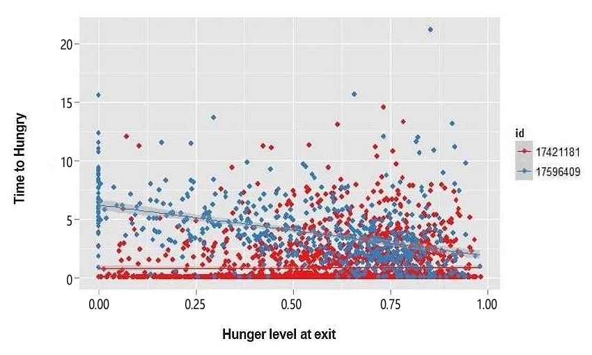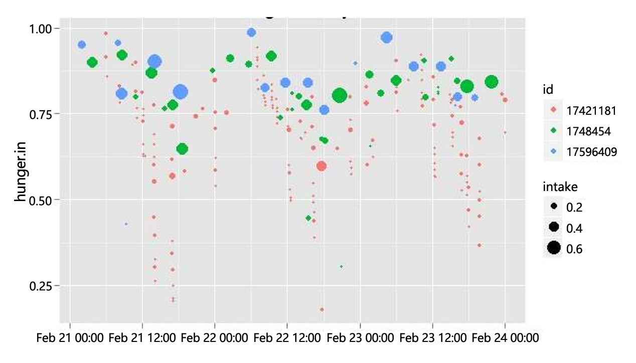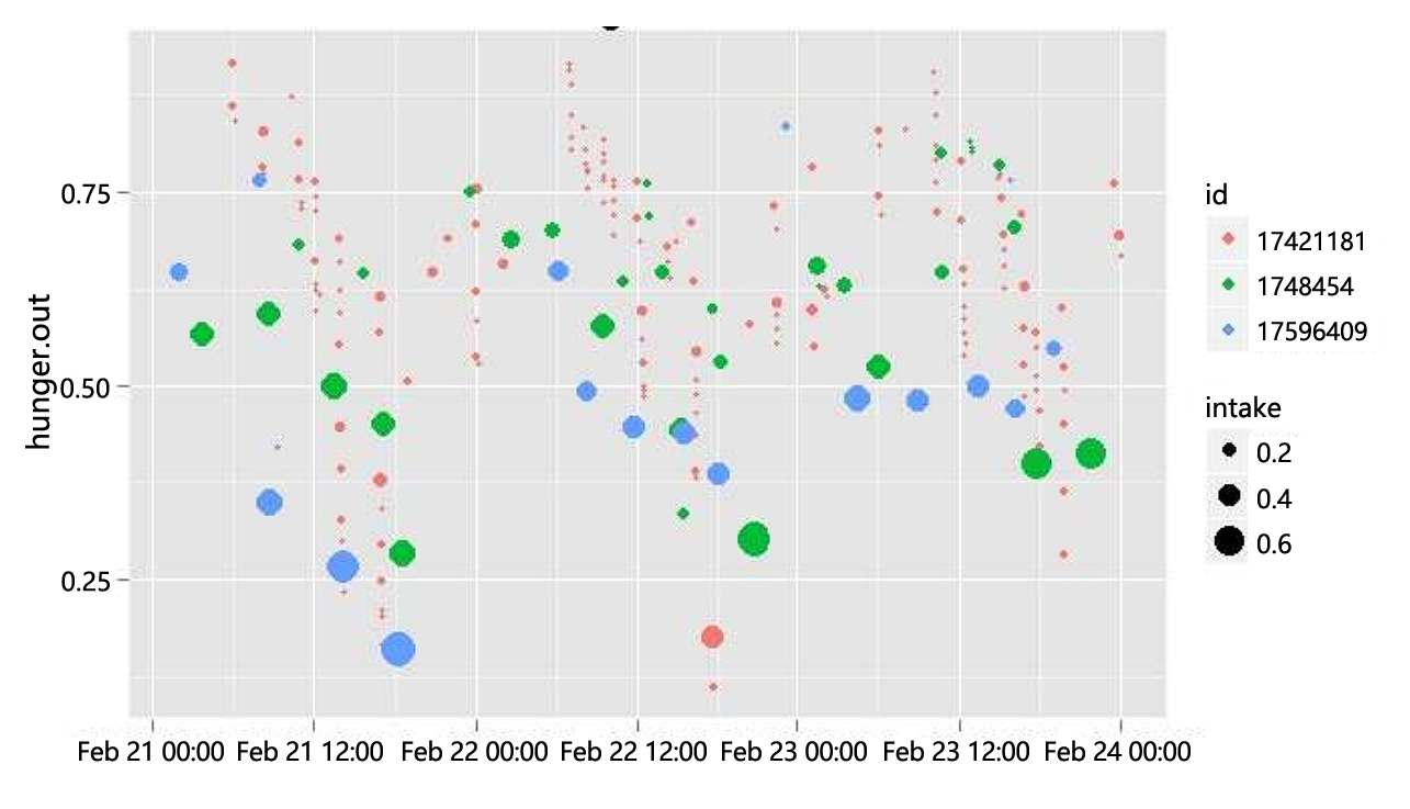 Figure 13. Hunger at the exit time. The size of the dots indicates the amount of intake.