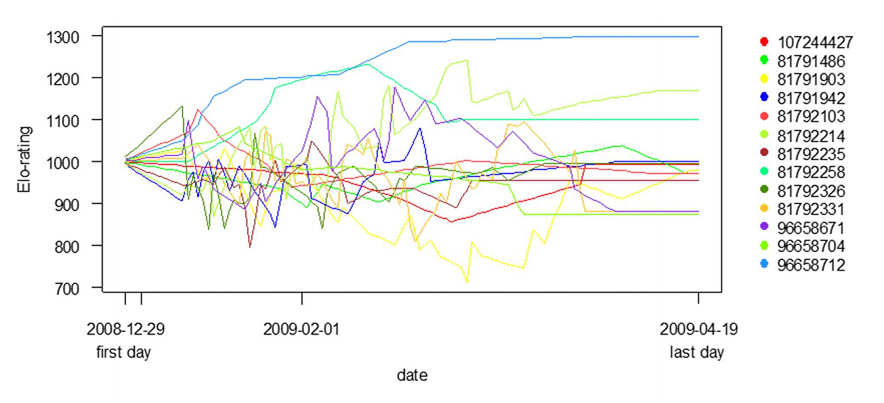 Here, F represents the cumulative Gaussian distribution function with a mean of 0 and a standard deviation of 1. The Elo measure is centered around 1000. For instance, an animal with an Elo rating of 1200 has a 76% probability of defeating an animal with a rating of 1000. Figure 14 illustrates the dynamic evolution of Elo ratings for all animals within a single box over time.