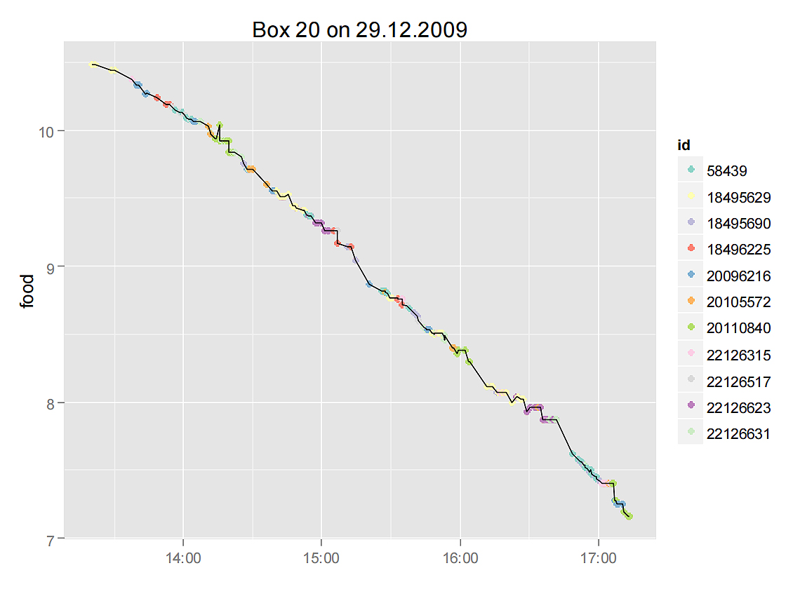 The number of feed decreases at a constant pace until the feeding trough is refilled with more feed. This refill process is done in fixed amounts. On Figure 18 is presented an example of a period, where feed decreases at a constant pace, nonetheless of the animal that is occupying the trough. This implies for our modeling purposes, that how the animals eat, the feeding speed, is very homogeneous across all animals. The rate we detect is nearly 1 kg of feed per hour.