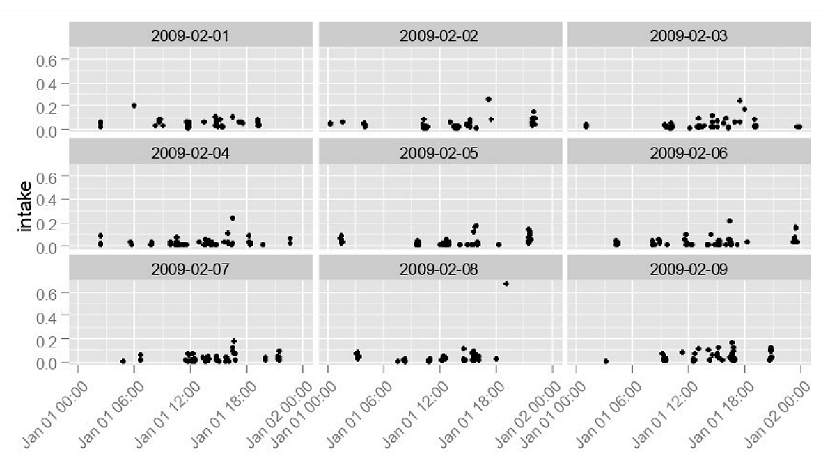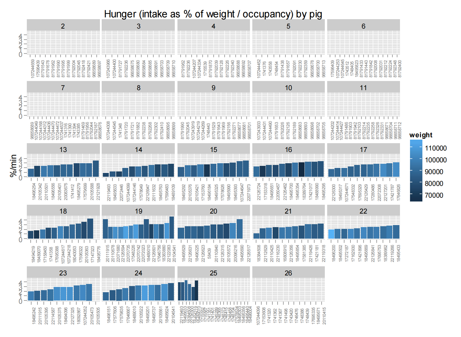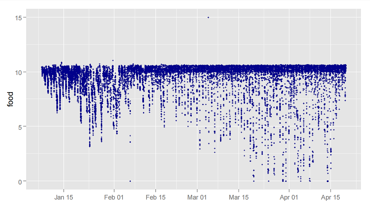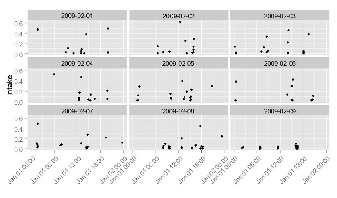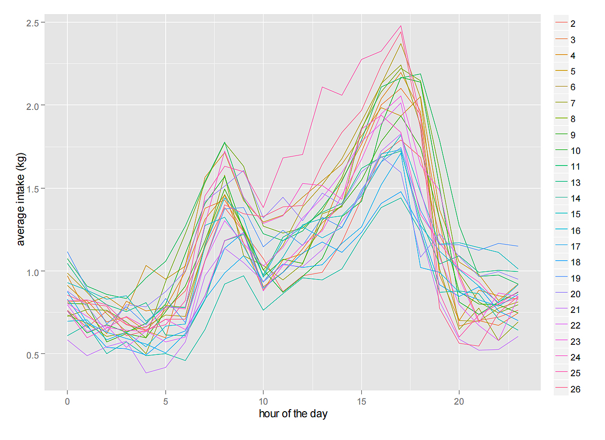 At this point, with the needed extra variables created and with the process of cleansing the raw data finished, we can start to derive some knowledge on the feeding pattern of the animals. Figure 17 shows a data sample for the quantity of feed, in kilograms, in the feeding trough. It is clear from Figure 17 how some individuals alternate the feeding trough occupancy. The visual representation of the intake data offers a first insight into the feeding habits of the animal which is pervasive across all boxes and over time: they tend to eat continuously throughout the day, but there are some periods of reduced activity, between midnight and sunrise; and some individuals show a more repetitive pattern to enter the trough, whereas others enter fewer times and stay longer periods.