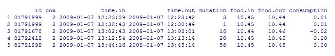 A single individual will be present in each dataset row, representing an entry and an exit in the feeding space, no more than one animal can be in this space. Figure 2 shows a consumption dataset sample.