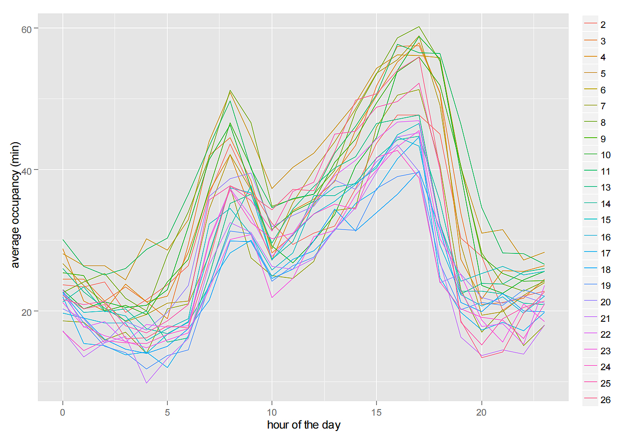 Figure 21. Average occupancy by an hour of the day. The lines represent the different boxes.