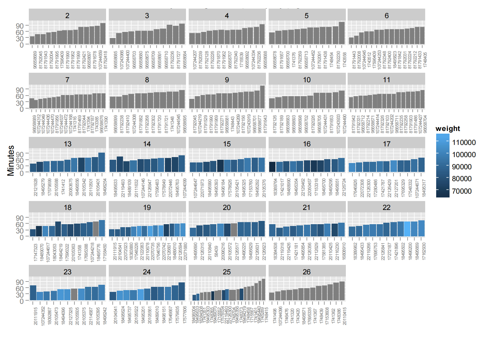 On the other side, if we analyze the animal weight, which is the only biometric variable available from the experiments, and the feeding habits, also there is no clear pattern to explain a relation. Figures 23 and 24 present intake and occupancy data for pigs with available weight data, categorized by box. While no apparent relationship exists between animal size and feeding dominance, it is evident that some heavier animals consume less feed and occupy the feeding trough for shorter durations, indicating a lack of dominant status despite their size.