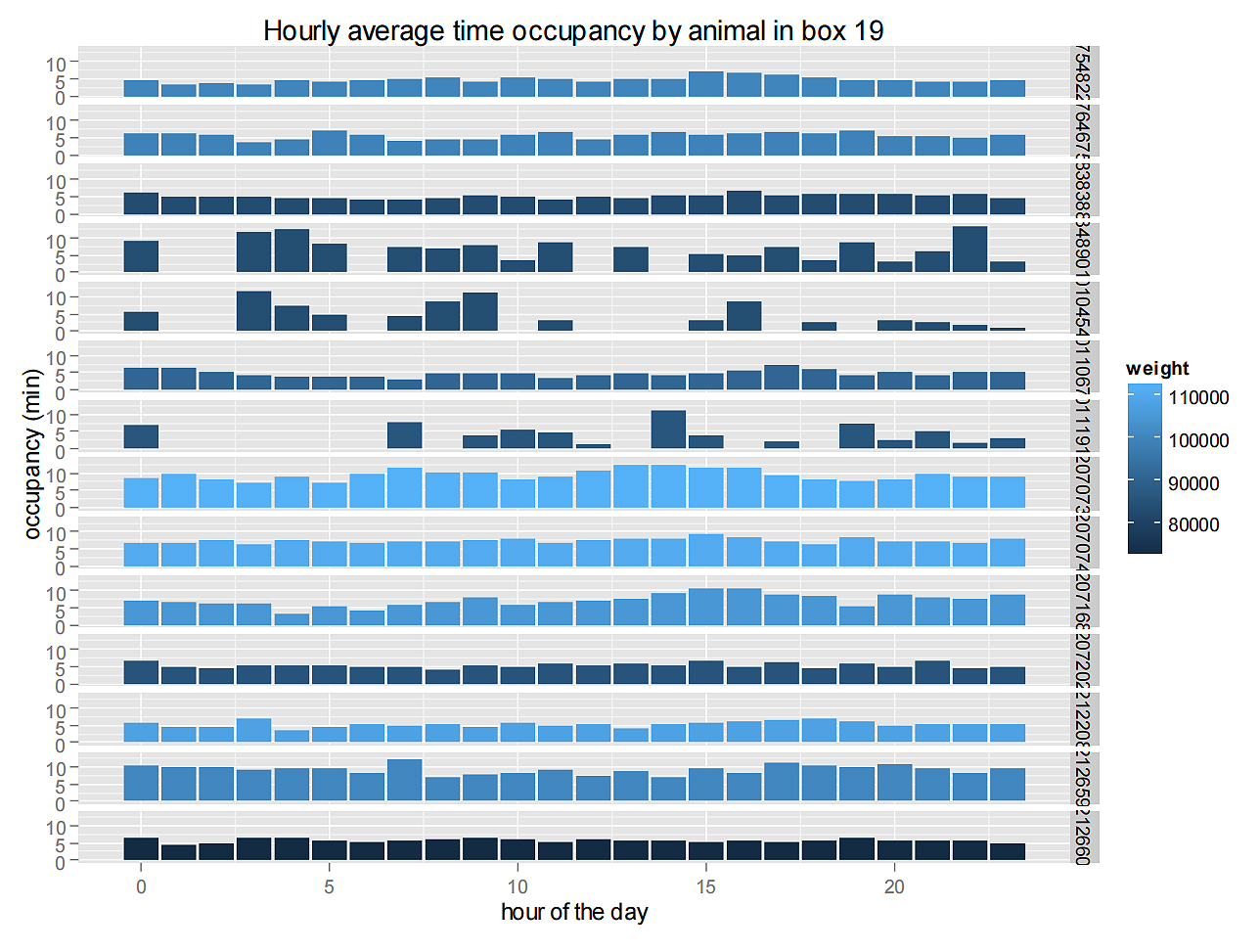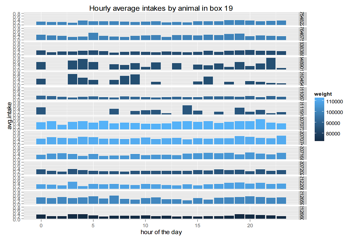 As previously discussed, certain animals display a pattern of more frequent, smaller meals, irrespective of their weight. Figure 26 presents the daily intake distribution for all animals within a single box.