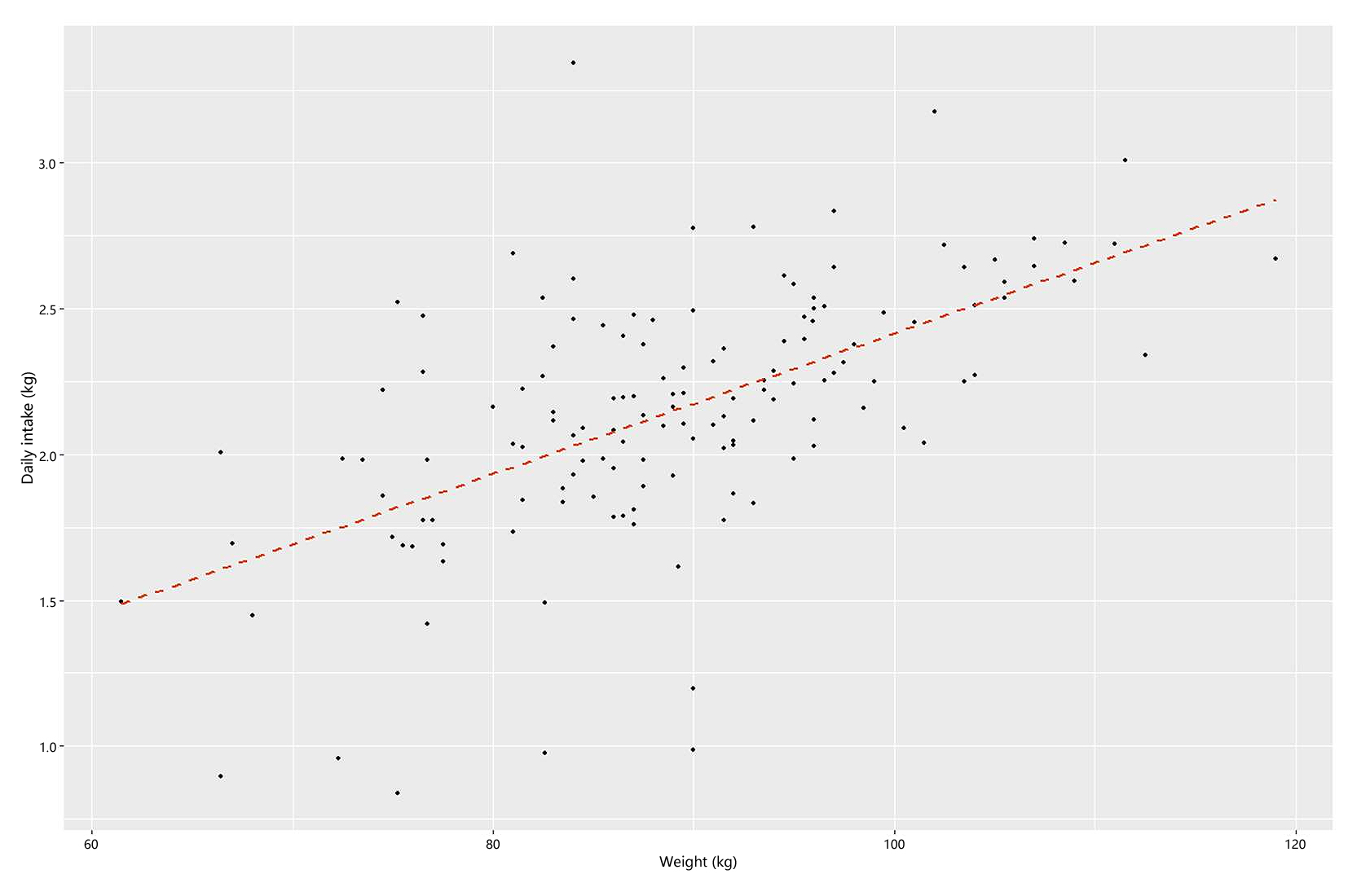 Figure 29. Weight vs Daily intake with the linear relation between the two variables.