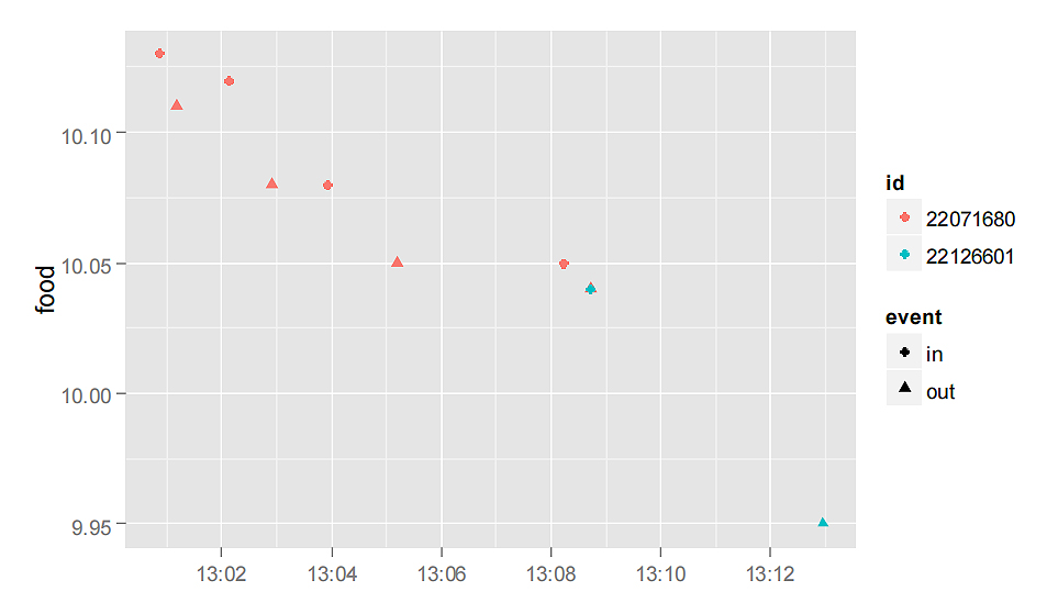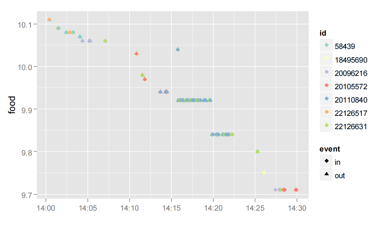 Figure 3 shows one box with a time interval of about 15 minutes. The dots represent the time when a pig enters (or leaves) the trough. Hence each dot represents an event, “in”, represented by a circle, and “out”, represented by a triangle. Also, the colors of the events are used to distinguish the different animals. The estimated feed intake for each animal can be calculated by subtracting the amount of feed remaining in the trough at the time of exit from the initial amount of feed present at the time of entry. It is important to note that some animals do not occupy the trough continuously but rather return to the trough multiple times throughout the feeding period. This intermittent feeding behavior can be observed in the data. Furthermore, the linear decrease in feed quantity over time suggests that animals maintain a relatively constant feeding rate while they are actively consuming feed from the trough.