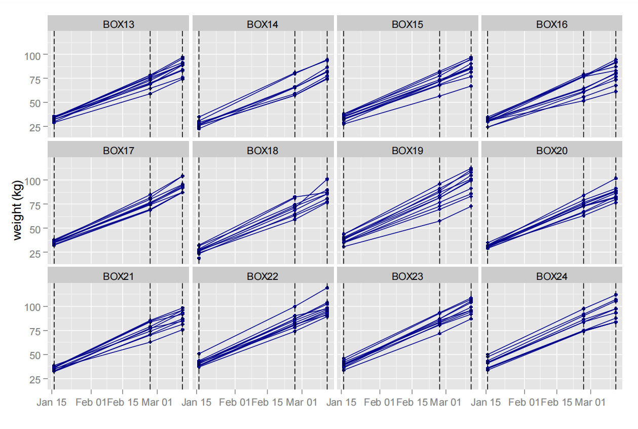 Pure male Duroc pigs were used for the experiment. Our analysis is done through the experimental data acquired from the devices, the weights, and the intake. Weight data was collected between January and March 2009. Feeding data was collected from December 2008 to April 2009. The experiment involved 24 groups of pigs, each group consisting of 11 to 21 individuals. Each group was housed in individual boxes, with only one pig allowed access to the feeding trough at any given time.