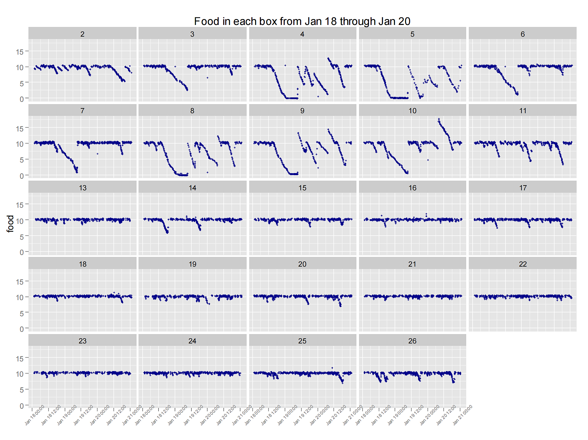 Figure 9 shows that only specific days in the time series present a lack of feed in the troughs in several boxes. Also, we can see that since some boxes experience feed scarcity at the same time it seems to have common processes to refill the feed.