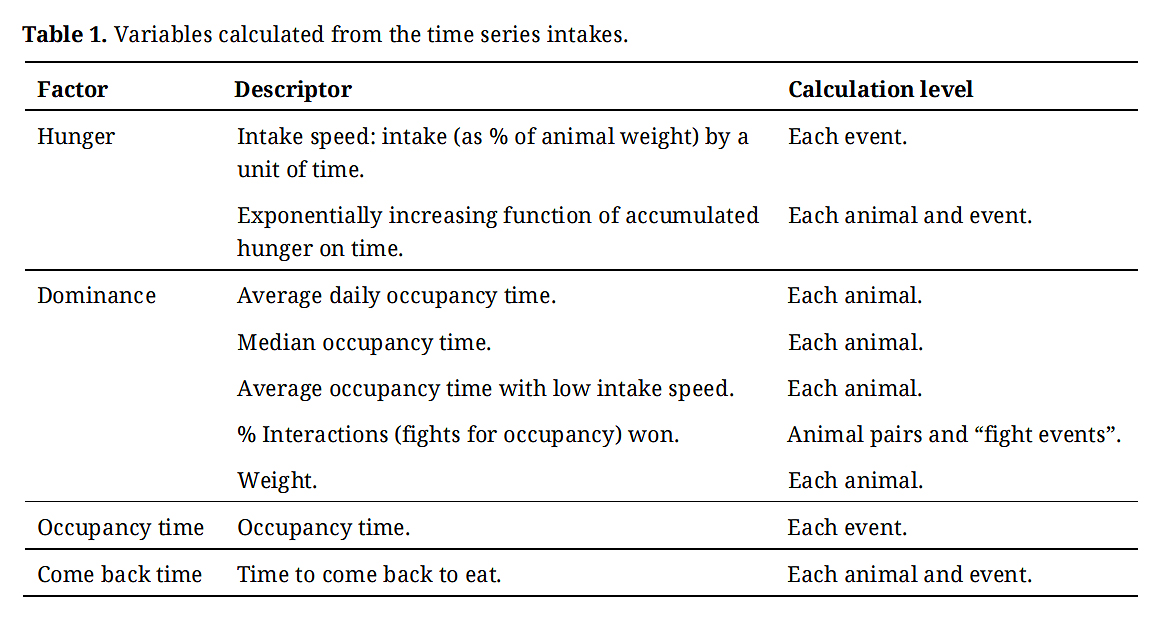We propose two additional variables: (i) a variable that decreases with feed intake and increases over time (Hunger level), and (ii) animal dominance, estimated indirectly from observed interactions within the data.