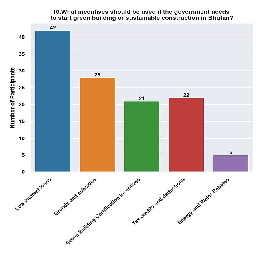Discussion of Respondence to Question No.10Low-interest Loans (35%) of respondents preferred low-interest loans as a motivator, suggesting that there is awareness of the potential financial obstacles that could prevent investment in environmentally friendly building practices (Figure 12). With the help of low-interest loans, developers and builders can finance green building projects without having to pay unreasonably high borrowing charges. In Bhutan, where financing may be scarce, particularly for smaller-scale projects, low-interest loans can promote market change and investment in environmentally friendly buildings.