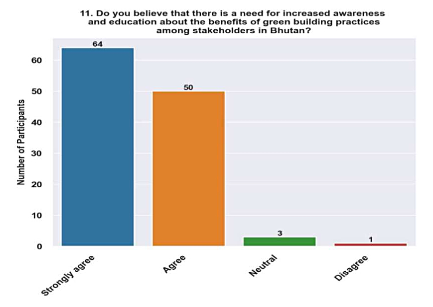 The increased awareness of green building in Bhutan could be attributed to various sources, including international collaborations, government regulations that support sustainable development, and a growing global debate on environmental conservation and climate change. To improve their proficiency in the design and execution of green buildings, experts in domains like engineering, urban planning, and architecture may also proactively pursue specialized education and certifications.
