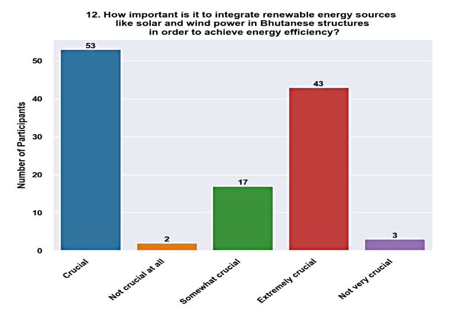 Discussion of Respondence to Question No.12Incorporating renewable energy sources into Bhutanese institutions is essential, as indicated by the combined percentage of respondents who deem it crucial (44.4%), extremely crucial (34.8%), and moderately crucial (14.5%) (Figure 14). This suggests that stakeholders generally agree on this. Bhutan has many sustainable energy resources, such as wind, solar, and hydropower. Utilizing these resources to produce clean electricity is consistent with Bhutan’s mission to combat climate change, promote sustainable development, and protect the environment. In addition to increasing energy independence, Bhutan may diversify its energy mix and contribute to international efforts to mitigate climate change by utilizing solar and wind power and hydropower.