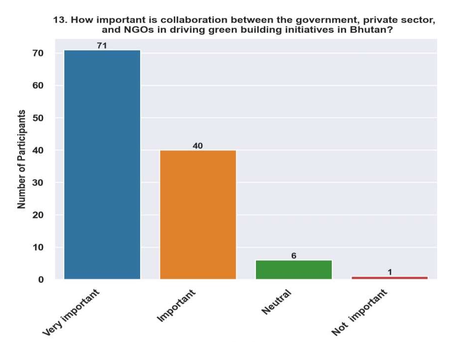 Discussion of Respondence to Question No.13Almost all the respondents felt that collaboration between the government, private sector, and non-governmental organizations in Bhutan further promotes sustainable building construction (Figure 15). The percentage of respondents who consider collaboration very significant (59.8%) and (34.2%) found it important. This indicates that stakeholders generally agree that various actors are interdependent and interconnected when achieving green building efforts. This acknowledgement shows that sustainable development necessitates coordinated efforts across numerous sectors, disciplines, and stakeholders to have a significant and long-lasting impact.