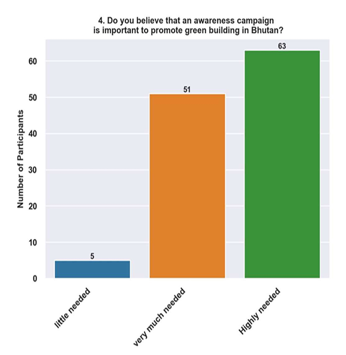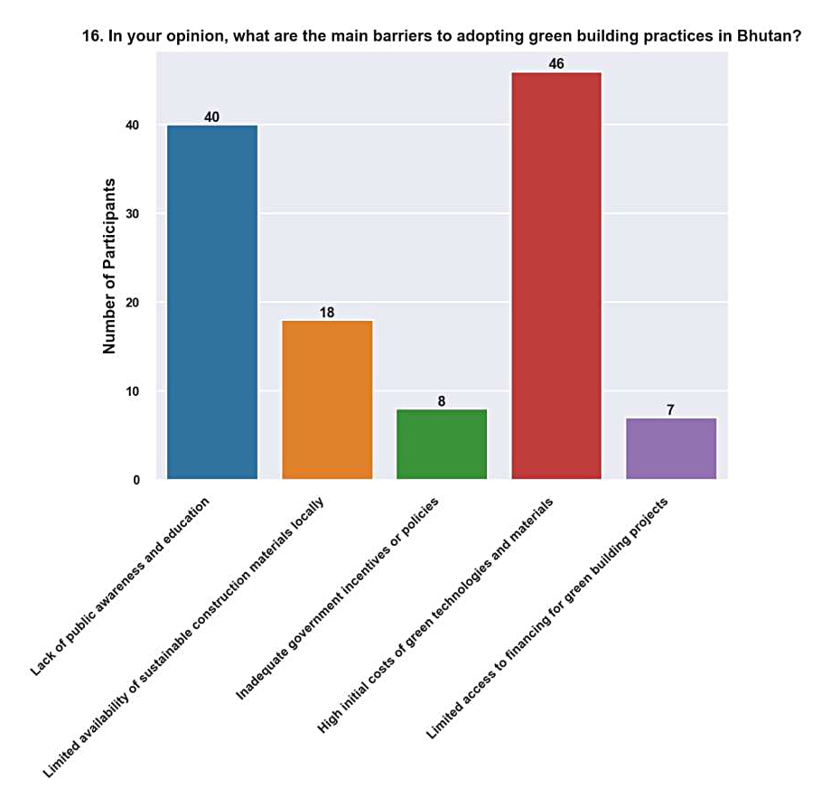 The comparatively high proportion of people in Bhutan who are at least somewhat aware of the environmental benefits of green building may be ascribed to continuous efforts to promote sustainability through advocacy, education, and policy interventions, as environmental conservation is deeply ingrained in national policies and cultural values. Nonetheless, there might still be chances to engage and educate stakeholders further to increase their comprehension and appreciation.