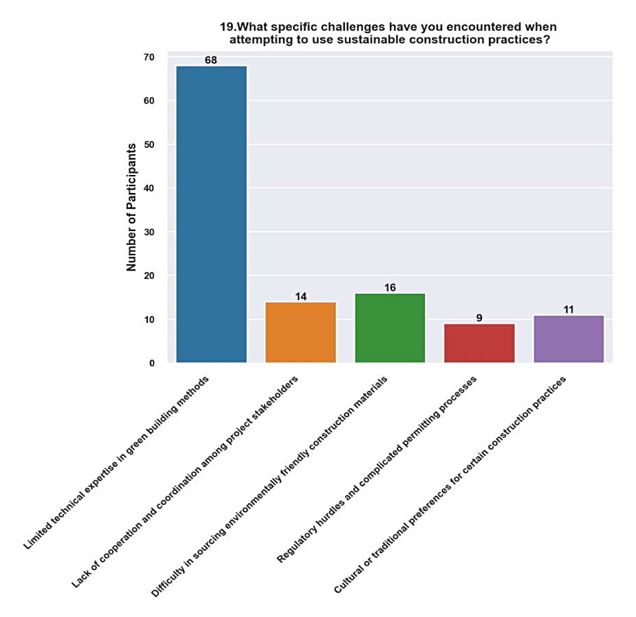 Very much needed (32.2%). The significant proportion of participants who expressed a strong need for awareness campaigns highlights the general agreement regarding the significance of taking proactive steps to improve knowledge and instruction regarding sustainability in the construction industry. This implies that stakeholders strongly desire focused interventions and programs that can clearly explain the benefits of sustainable practices and encourage behavioural change.