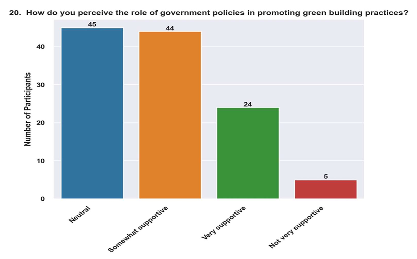Somewhat Supportive (37.6%). The slightly supportive response indicates that even while the respondents accept the government’s efforts to promote green building, they may believe that further steps or improvements are required to fully realize these policies’ potential. This perception may stem from a desire for more extensive incentives, stringent enforcement, or better alignment with national development goals.