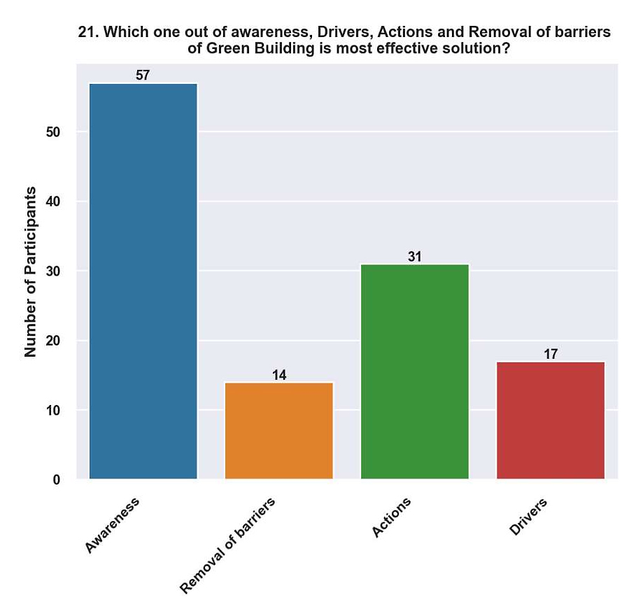 Discussion of Respondence to Question No.21Awareness (47.9%) (Figure 23). Awareness is the degree of knowledge and comprehension that people, communities, and stakeholders have about green construction’s significance, advantages, and practices. In Bhutan, promoting green building practices means teaching people about the benefits of sustainable construction techniques in terms of the environment, society, and economy. This entails advocating for ideas like water conservation, energy efficiency, using renewable resources, and reducing carbon footprints in building design and construction.
