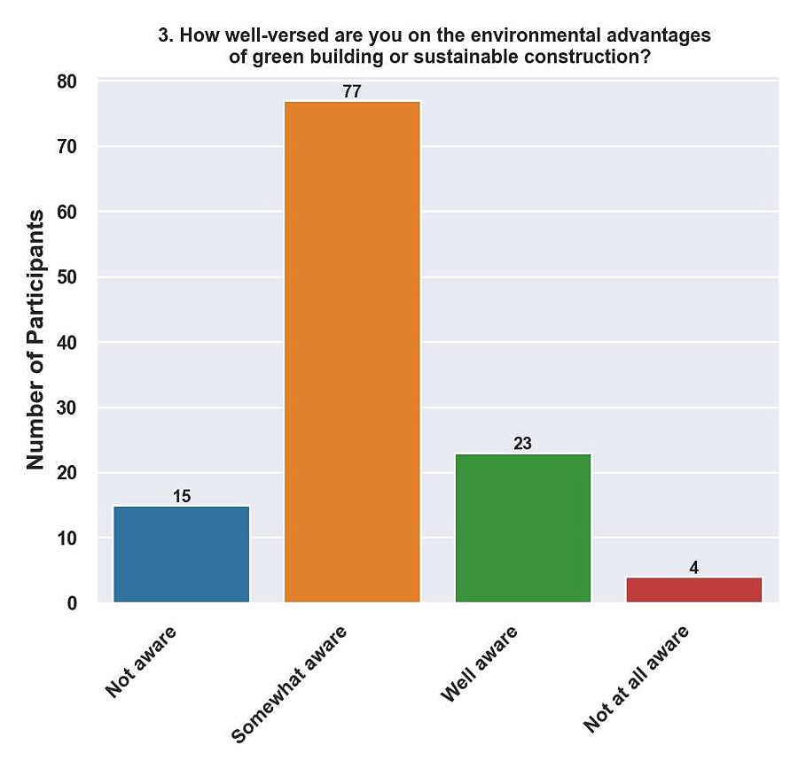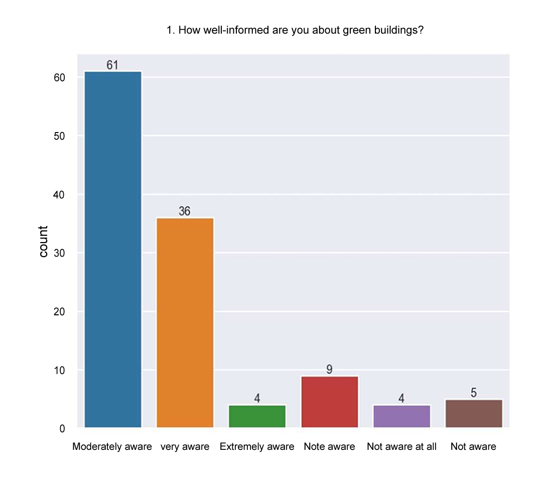 Very Aware (30.5%). The significant proportion of participants who were categorized as “Very Aware” implies a greater degree of familiarity and involvement with the concepts and methods of green building. These people know cutting-edge sustainability ideas, technology, and eco-friendly building best practices better.