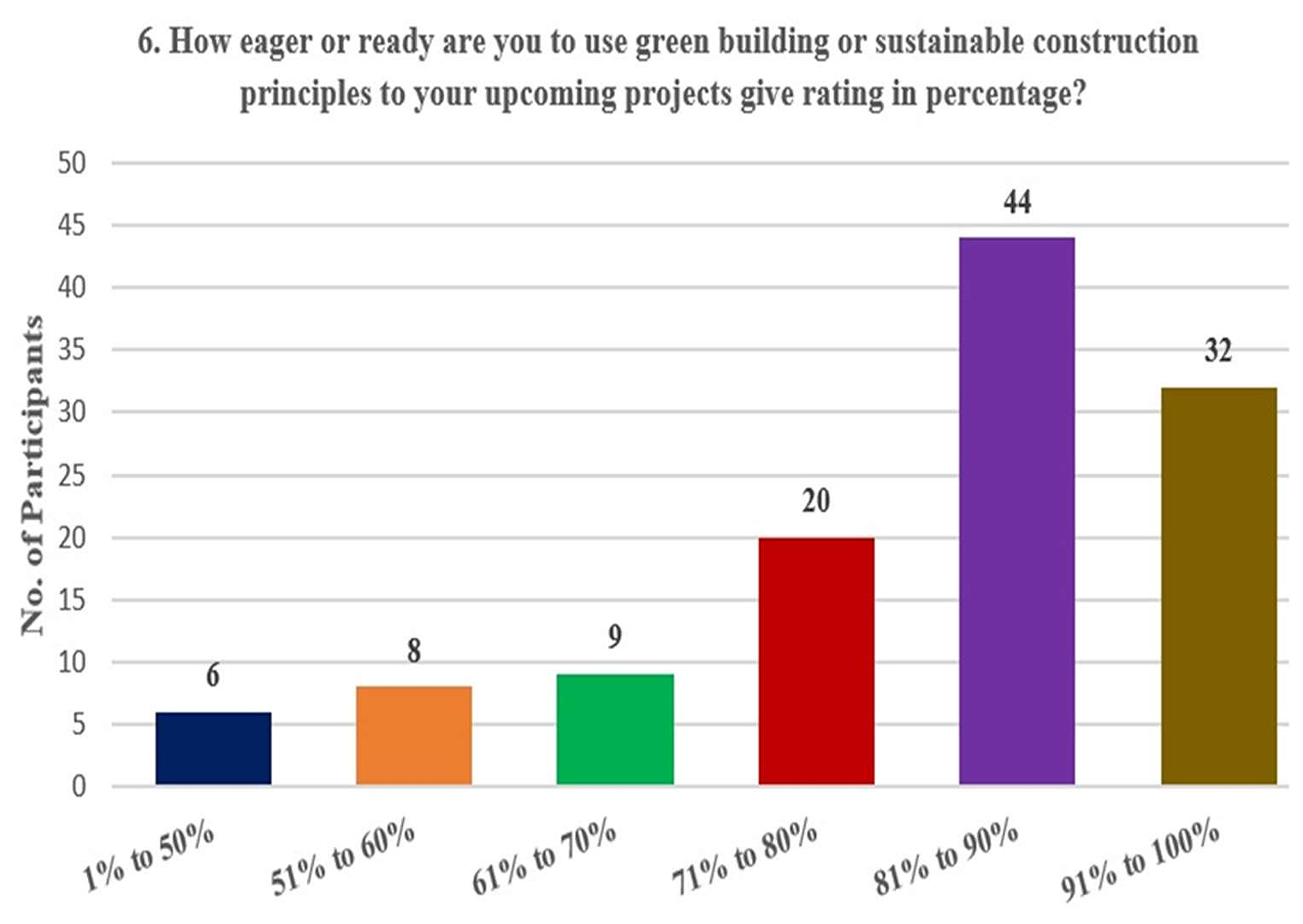 Discussion of Respondence to Question No.681% to 90% Willing (37.3%) (Figure 8). The noteworthy proportion of participants with a preparedness level ranging from 81 to 90% suggests a high preference for integrating green construction principles into future projects. This indicates that a sizable percentage of Bhutanese stakeholders are aware of the benefits of sustainable construction methods and are eager to incorporate them into their projects to a large degree.